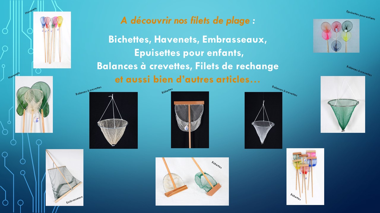 Nous fabriquons des filets sur mesure (longueur, hauteur, maille) dans nos ateliers : Araignées, Sennes classique ou qualité supérieure. Mais aussi nous proposons des Eperviers, Carrelets, tramails mer.